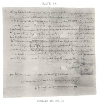 「番仔契」[1]chiah有法度證實「新港文」e存在。 經濟資源e剝削kap基督教義e傳播是荷蘭統治台灣e 2大目的。甘為霖牧師(Rev. William Campbell 1871-1918) ti伊e冊「荷蘭統治下e台灣」(Formosa under the Dutch)內底記載講:「彼當時, in [荷蘭人] m-na真gau做生理、賺真濟錢,koh真成功e推廣教育kap基督教義;荷蘭傳教士 伊家己一個就有才調經營管理kui-a間學校,收超過5,000人加入教會做基督徒」。[2] Hit當時傳教e方法之一就是透過當地e語言來傳授教義。為著使用當地e語言,傳教士就利用羅馬字來設計一套esai描寫當地語言、koh簡單好學e文字系統。即套羅馬字書寫系統,一方面etang幫贊傳教士 紀錄、學習當地e語言,一方面ma esai乎當地e人真簡單就看會曉用in家己e語言寫e聖經kap基督教義e冊。「新港文」就是an-ne產生e。台南附近e平埔族因為荷蘭人傳教e影響之下,soah tau-tau-a會曉用羅馬字來讀寫in家己e語言。荷蘭人ma因為傳教e需要,出版一寡羅馬字e教材,ka一寡基督教義e冊kap聖經翻譯做「新港文」。譬如講由Daniel Gravius翻譯e荷蘭、新港文對照e《馬太福音[3]》ti 1661年出版。 Ti國姓爺(Koxinga;鄭成功)趕走荷蘭人了後,雖然「漢字」chian做hit當時e官方文字,m-koh羅馬字式e「新港文」iau ti民間流傳使用一cham時間。當Siraya e語言tau-tau-a消失去e時袸,咱人chiah ti 19世紀尾e時發現in過去bat使用羅馬字e證據。即寡證據就是一寡用「新港文」寫e古文件。In有e 規張kan-na用「新港文」寫,ma有「新港文」ham「漢字」lam leh對照寫。即寡古文件,大部份是買賣、抵押、或者出租e契約(村上直次郎1933:IV)。因為即寡古文件大部份long ti「新港[4]」地區發現e,所以學者ka號做「新港文書」,一般大眾有e ka叫做「番仔契」(賴1990:125-127)。Ti即份研究論文內底就ka即e時期e「羅馬字書寫系統」統稱做「新港文」。 根據「村上直次郎」(1933:XV)e研究,現存e新港文書大概有141件。Ti即百thong件e文書內底,上早e是1683年所寫e,上oan e是1813年。可見至少ti 19世紀初iau有Siraya e族人會曉寫「新港文」。 圖表 2. 村上直次郎所收集,編號75號e新港文書。