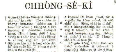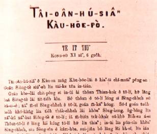 e口語,無像漢字anne學真久iau讀be出正確e發音。 「白話字」上頭仔是為著傳教e目的chiah發展出來e。所以「白話字」真大部份e應用kap出版long是ham宗教有關係e。即寡運用白話字e出版品或者個人e應用 大概esai分類做下面6類: l 白話字教材 l 白話字字典、辭典 l 聖經、教義問答、kap宣傳小冊等 l 白話字報紙、雜誌 l 其他有關哲學、數理、小說等題材 l 個人e筆記或者寫批 自19世紀開始,有be少e白話字字(辭)典出版,下面就簡單舉一寡例。「麥都思」(Water H. Medhurst 1796-1857) ti 1837年出版《福建方言字典[2]》;「杜嘉德」牧師(Carstairs Douglas 1830-1877) ti 1873年出版《廈英大辭典[3]》;現此時ti台灣上普遍得使用e《廈門音新字典[4]》是由「甘為霖」牧師編輯,ti 1913年由台南e教會公報社發行(參閱賴1990;洪1993b,1996)。 頭一本白話字e新約聖經《咱的救主耶穌基督的新約[5]》ti 1873年出版,舊約聖經《舊約的聖經[6]》ti 1884年出版。對白話字ti早期e台灣教會hong普遍使用有真大貢獻e白話字報紙《台灣府城教會報[7]》ti 1885年由巴克禮牧師發行。白話字出版品e內容除了直接ham宗教有關之外,ma有一寡kap教義khah無關係e物仔。像講,1897年Gê Uî –Lîm出版e數學冊《筆算的初學[8]》;1917年戴仁壽(G. Gushue-Taylor)出版e《內外科看護學[9]》;1926年鄭溪泮(Ten Khe-phoan)所出版e小說《出死線[10]》;1925年蔡培火(Chhoa Poe-hoe)所出版e社會評論e冊《十項管見[11]》。 通常,教會e信徒ti教會學會曉讀寫白話字了,in會ka即套白話字應用ti日常生活當中,像講寫批乎hau-sen chou-kian (後生、查某囝)、寫日記、或者做大細項代誌e筆記。白話字ti 1970年代[12]儘前,ti台灣e教會內底iau算hong真普遍e使用;毋過,了後因為政治kap「國語政策」e影響,soah tau-tau-a愈來愈少人使用。 雖然白話字對普及教育e貢獻無分查晡、查某,白話字對女性教友e影響特別大。Ti古早重男輕女e社會,一般查某人long真罕leh有機會受漢文e教育。即e現象一方面是因為文化價值觀(重男輕女) e問題,一方面ma是經濟問題(漢字比白話字ke真歹學)。即寡查某人ti接觸教會了,tu-ho乎in通學習簡單e文字工具(白話字)、有受教育e機會。In毋但透過白話字來學習聖經e教義,ma esai學習現代e智識。現此時ti台灣iau有一寡老一輩e教友(特別是女性),m bat漢字、kan-taN會曉白話字。[13] 雖然「白話字」上頭仔是為著傳教e目的所設計,到tan來已經無限定ti描寫教會e事務nia。Ti 1980年代[14]以後,對著台灣政治運動e開展,台灣e本土文化界ma展開台語文運動,強烈訴求「嘴講台語[15]、手寫台灣文」。Ti現此時khah普遍e三種台文書寫方式「全漢」、「全羅」、kap「漢羅」內底所用e台語羅馬字,真濟團體或者個人就是使用白話字或者修改過e白話字來出版台文作品。[16]像講,「台文通訊」、「台文罔報」、kap「台譯5%計劃」[17]等團體,ti羅馬字e部分long用傳統教會白話字。因為參予台文寫作e作者e多元化,「白話字」e應用ma脫離過去以教會、傳教為主e題材。 圖表 3. 《台灣府城教會報》頭一期(1885)。