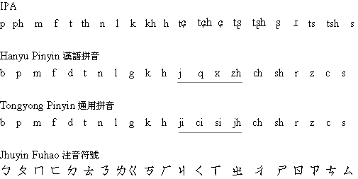 Mandarin consonants represented by IPA, HP, TYP, and Jhuyin Fuhao. [1] For details, see Png 1965; Gao 1992; Chen 1999; Tsao 1999; Norman 1988; DeFrancis 1950; Jhou 1978. [2] The purpose of using Jhuyin Fuhao ‘sound-annotating symbols’ is to “dispel any faint hope that they were to be used as bona fide writing systems” (Chen 1999:189). This scheme was later called Guoyu jhuyin fuhao di yi shih or National Phonetic Symbols, 1st Scheme in Taiwan (henceforth NPS1). [3] Latinxua sin wenz was first published in 1929 and employed among the 10,000 Chinese living in the USSR. It was considered an autonomous writing system and later introduced to China. This scheme was very popular especially in the Northwestern part of China where were under the control of the Chinese Communist Party at that time (Chen 1999:184-186). [4] Guoyu Luomazi was renamed National Phonetic Symbols 2nd Scheme, to distinguish it from the 1st scheme of Jhuyin Fuhao. [5] Even for the government, different departments and different counties may use different romanized schemes. [6] In Taiwan, the K.K. phonetic symbols are taught in schools serving as instructions of pronunciations in learning English. [7] For more discussion on these schemes, see Cheng 2000; Tsao 1999. [8] Literally means to get connection to the world. [9] The 4th nuclear power plant in Taiwan was approved and under construction in the 1990s during the period of KMT government. After the DPP became the ruling party, the new government stopped its construction. Consequently, it aroused protests and boycott from the opposition parties, which proposed to unseat the new president Chen Shui-bian. [10] For example, in a press conference on November 29, 2000 the Guotaiban (Office for Taiwan Affairs) of the PRC claimed that someone was trying to promote Taiwanese independence in the areas of culture and education through using a different transliteration scheme from Hanyu pinyin. [11] For example, if Ma really was concerned about the international standardization and globalization, he should also abandon the Jhuyin Fuhao, which is used in Taiwan only.