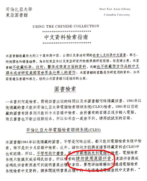 台灣e教育部長 曾志朗先生為著支持「漢語拼音」方案,講啥物ti國際上無用「漢語拼音」就會乎人查無資料,結果無影無跡。 以東亞研究出名e美國 哥倫比亞大學(Columbia University) e東亞圖書館就無採用漢語拼音做電腦檢索e拼音輸入方案。請看下面哥倫比亞大學東亞圖書館公佈e傳單。 (chhih一下,就esai看著koh卡清楚e圖 119K)