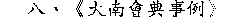 《大南會典事例》原稱《欽定大南會典事例》,共二百六十四卷,阮朝敕撰,1855年完成。刻本。此書依《大清會典事例》的形式,把阮初至嗣德五年(1852年)的事例分類和加以整理,是研究阮代的基本史料,其重要性僅次於《大南實錄》。1965年起,西貢出版了附有原文的部分越南語譯。