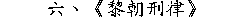 《黎朝刑律》是黎朝時代(1428-1789年)官撰,但成立年代不詳。六卷12章721條,是越南現存最古的法典。現存的寫本是1908年在順化發現的,其淵源郤不甚明確,學者認為應與下列兩種文獻有關:其一,是以黎朝聖宗時制定洪德條律(刑律)為基礎,於1767年刊行的《國朝條律》。現存的木刻本《國朝刑律》六卷,幾乎與《國朝條律》的內容相同;《黎朝刑律》被認為是後代手寫的《國朝條律》,《歷朝憲章類誌》的〈刑律誌〉亦收錄入內9。其二,是《律書》六卷,這可能是十五世紀的洪德原律,或者是阮薦之作。