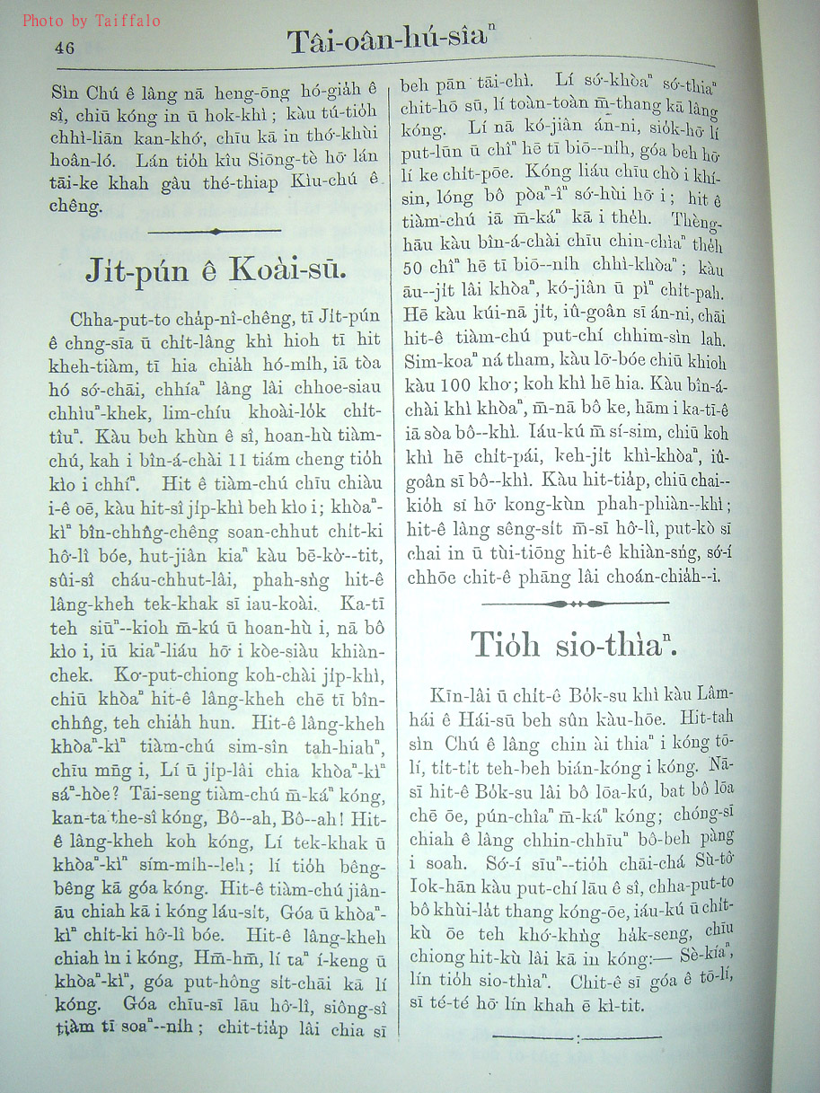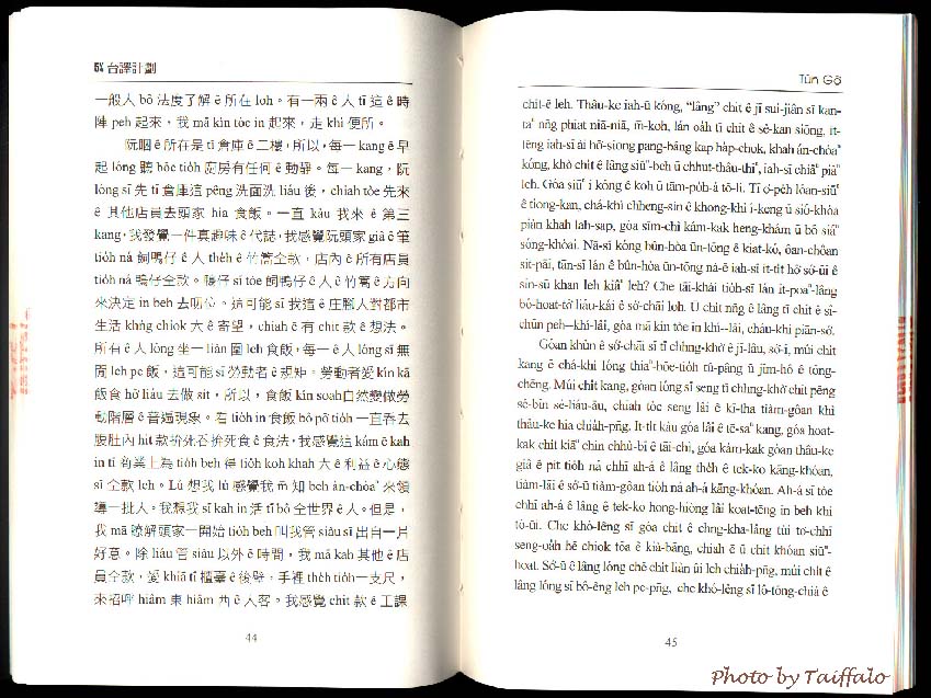 Tai-ek 5% sou hoan-ek e Taioan mia-tu "Bu Hoa Ko" (Han-Lo ham Peh-oe-ji 2 chiong pan-pun, 1997) 台譯5%所翻譯e台灣名著 A novel translated by the Tai-ek 5%, published in 2 versions, i.e. Han-Lo and Peh-oe-ji (pp. 44-45, 1997)